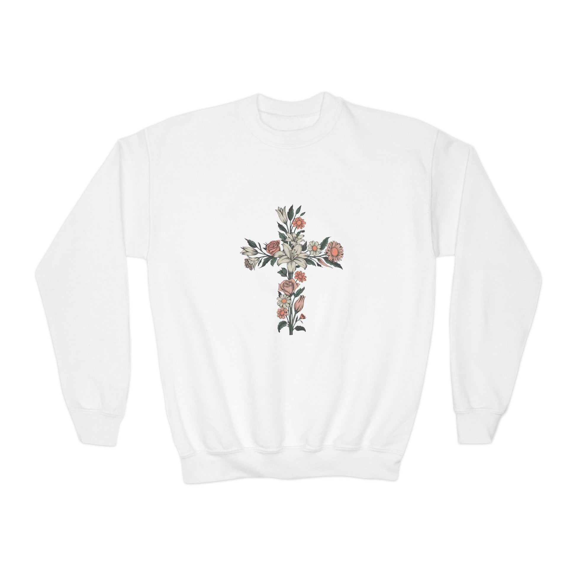 Plant seeds of faith early with the Flower Cross Crewneck. This sweet, meaningful design combines the symbol of the cross with blooming flowers, reminding our little ones that God’s love brings life and beauty to everything it touches.